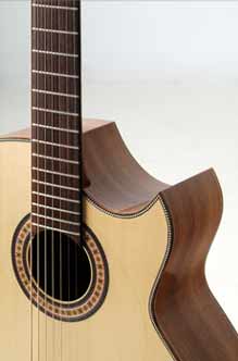 The Duende 6&7 guitars are serious crossover instruments. Classical, jazz and electric players will feel equally at home on this guitar. Being the nylon string cousin to the Studio Steel, this guitar is ergonomically superior to the traditional classical guitar. Comfortably radiused fingerboard, narrower nut spacing, slim neck and low action geometry facilitates playing for long periods or performing demanding music with minimum fatigue to the musician.