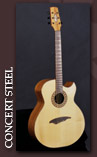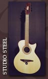 Studio Steel “The comfort and balance of a small body with the power of a dreadnaught, the ultimate all-rounder” 16 years of development yielded this design. Outperforms much larger instruments in both volume and balance up to the very last fret which is fully accessible thanks to the heel-less neck and deep cutaway. Also available without cutaway.