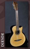 The Duende 6&7 guitars are serious crossover instruments. Classical, jazz and electric players will feel equally at home on this guitar. Being the nylon string cousin to the Studio Steel, this guitar is ergonomically superior to the traditional classical guitar. Comfortably radiused fingerboard, narrower nut spacing, slim neck and low action geometry facilitates playing for long periods or performing demanding music with minimum fatigue to the musician.